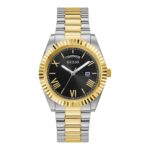 - Stainless steel strap, silver and gold colored coating, polished / mat, folding clasp